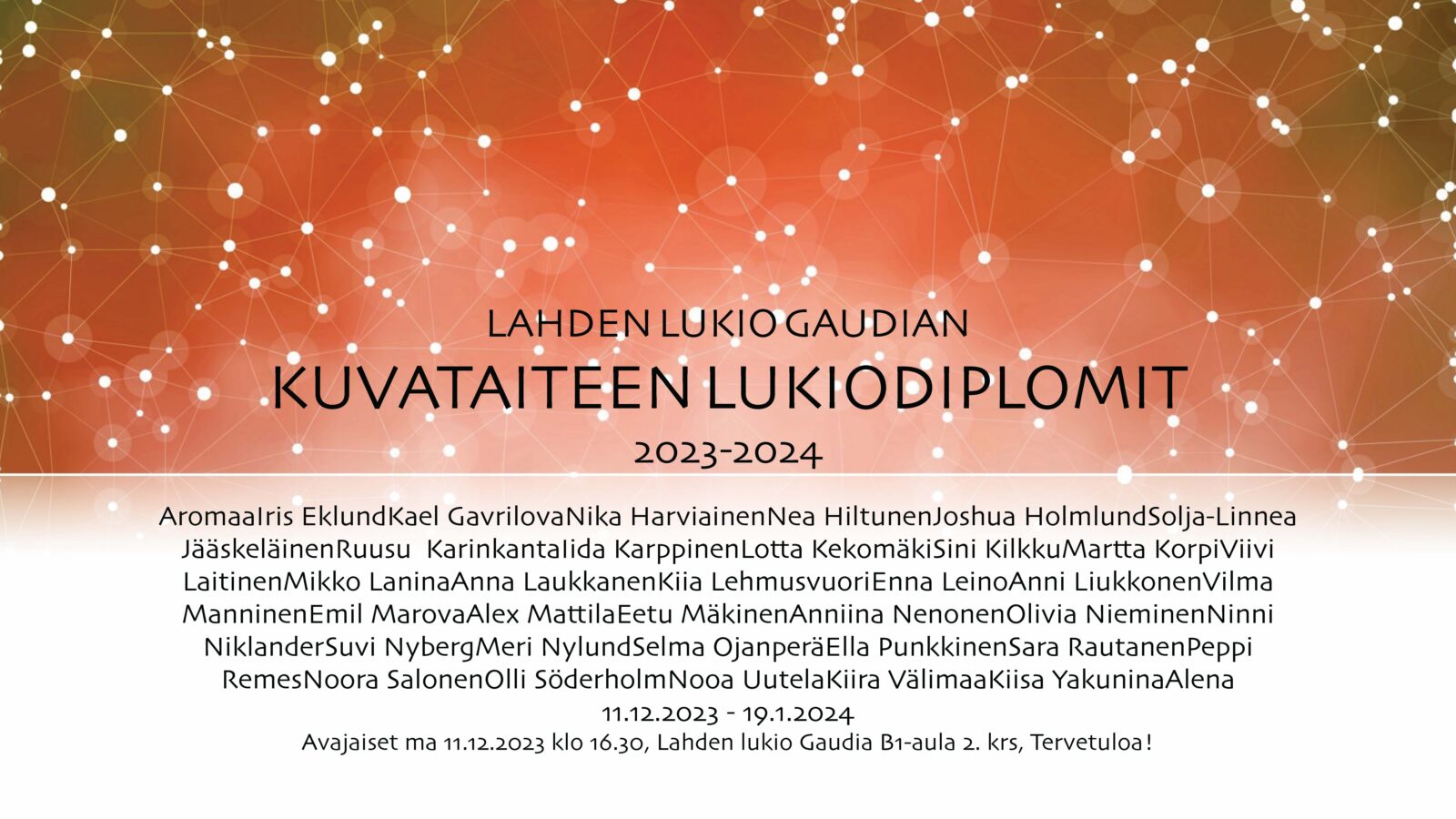 Lahden lukio Gaudian Kuvataiteen lukiodiplominäyttely on esillä 11.12.2023 – 19.1.2024, näyttelyn avajaiset ovat maanantaina 11.12.2023 klo 16.30.